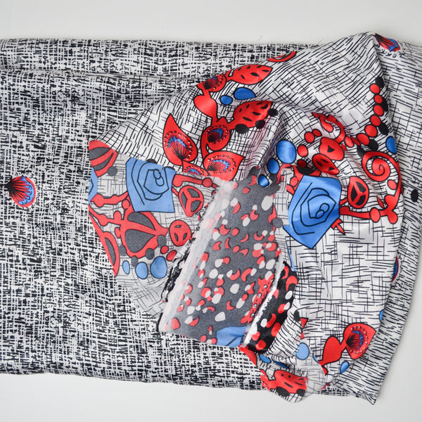 Black, White, Red + Blue Geometric Floral Print Satin Woven Fabric - 45" x 132"
