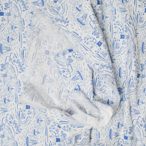 Blue + White Illustrated Boat + Lighthouse Print Quilting Weight Woven Fabric - 41" x 168"