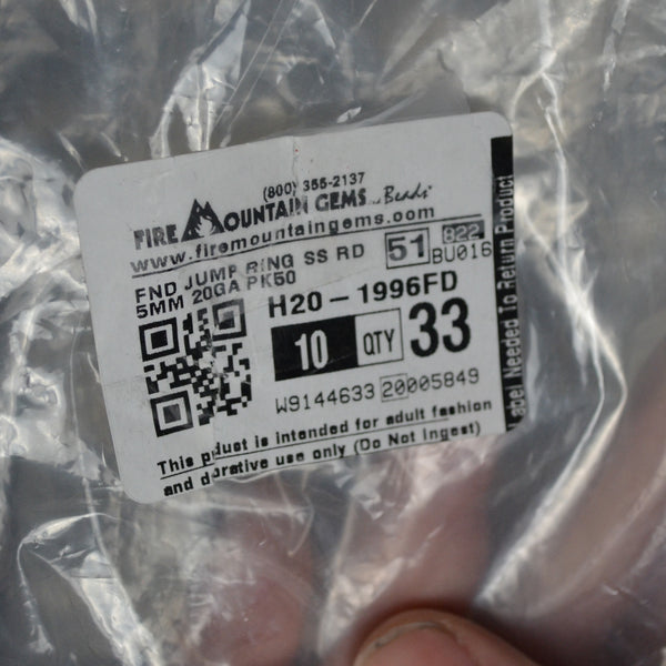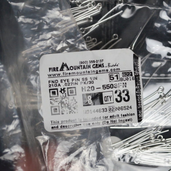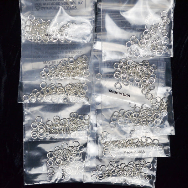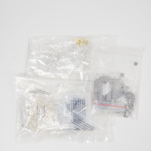 Using Fire Mountain Gems product codes, this bundle includes 3 troy ounces of 7016MB (Bead, antiqued sterling silver, 6x2mm rondelle. Sold per 1-troy ounce pkg, approximately 80-100 beads), 10 packs of 1996FD (Jump ring, sterling silver, 5mm round, 3.4mm inside diameter, 20 gauge. Sold per pkg of 50), and 7 packs of 5503FN (Eye pin, sterling silver, 1-1/2 inch, 21 gauge. Sold per pkg of 20).