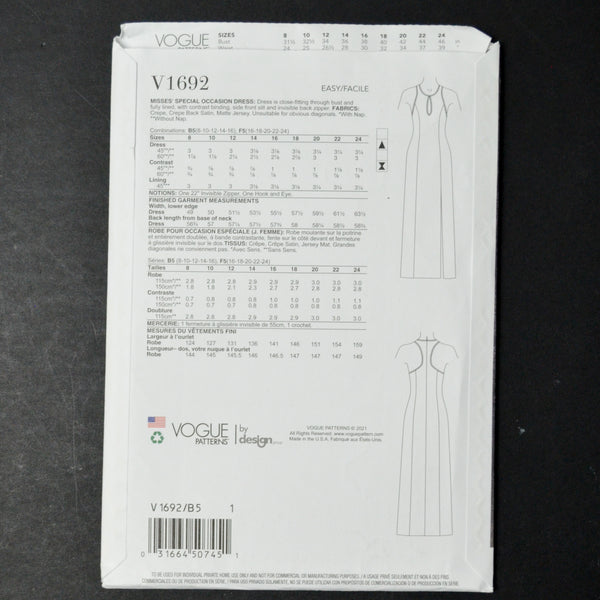 Vogue V1692 Misses' Special Occasion Dress Sewing Pattern - Size B5 (8-16)