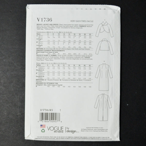 Vogue V1736 Misses' Jacket and Dress Sewing Pattern - Size A5 (6-14)