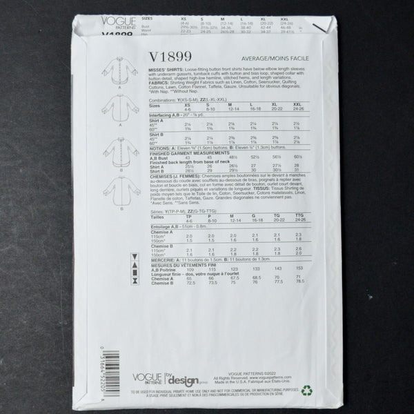 Vogue V1899 Misses' Shirts Sewing Pattern - Size Y (XS-M)