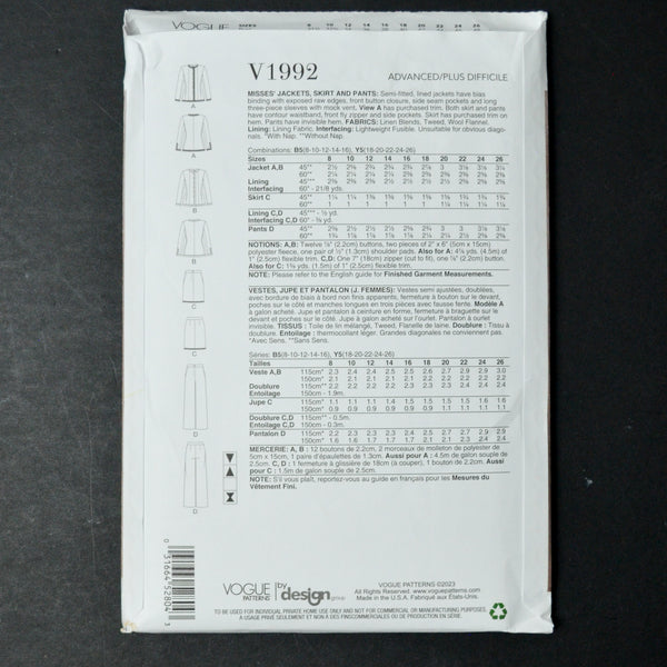 Vogue V1992 Misses' Jackets, Skirt and Pants Sewing Pattern - Size B5 (8-16)