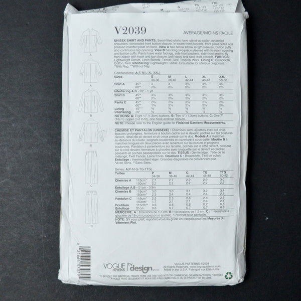 Vogue 2039 Unisex Shirt and Pants - Size A (S-XXL)