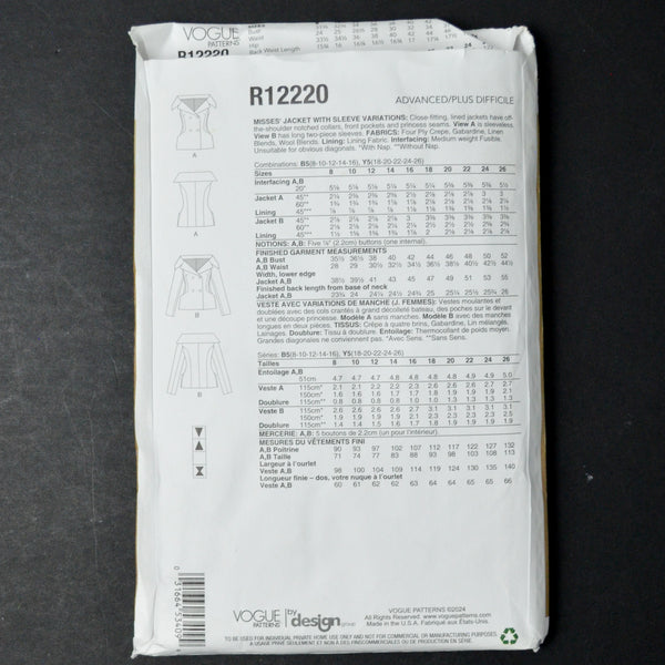 Vogue 12220 Misses' Jacket with Sleeve Variations Sewing Pattern - Size B5 (8-16)