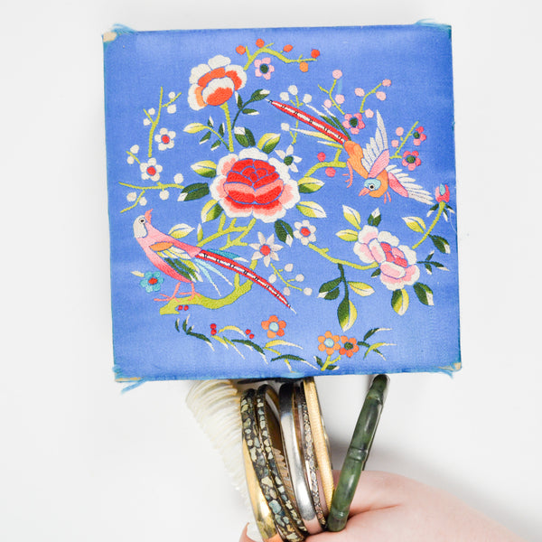 Vintage Jewelry Bundle in Bird Embroidered Jewelry Box - Brooches, Bangles, Earrings + Bracelets