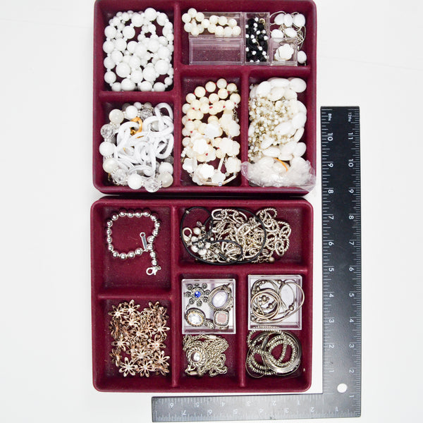 White + Silver Tone Charms + Costume Jewelry Bundle in Organizing Tray