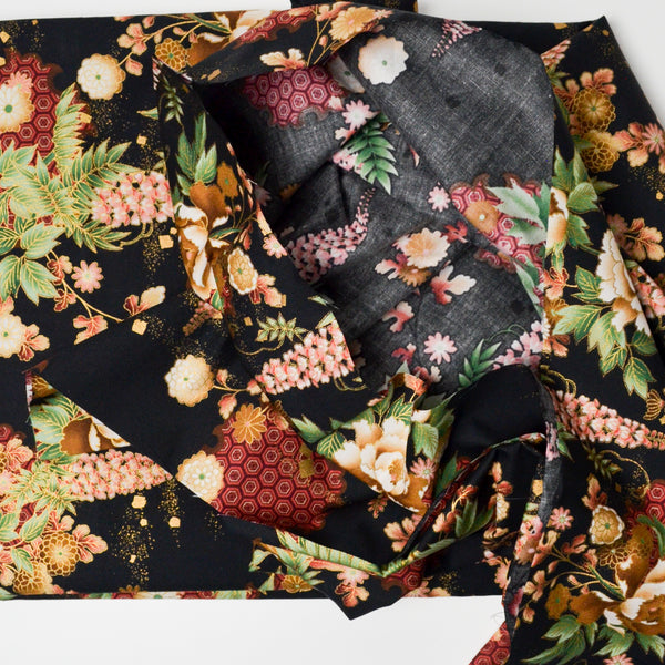 Black, Gold + Green Floral Print Quilting Weight Woven Fabric - 44" x 152"
